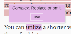 보라색 : 해당 단어를 대신하는 짧은 단어가 있다. 마우스 오버를 하면 대체 단어가 보임.